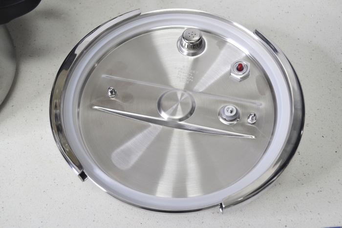 拆开包装,里面整齐摆放着压力锅体、锅盖、限压阀堵盖以及说明书。这里必须重点提醒:拿到压力锅后,