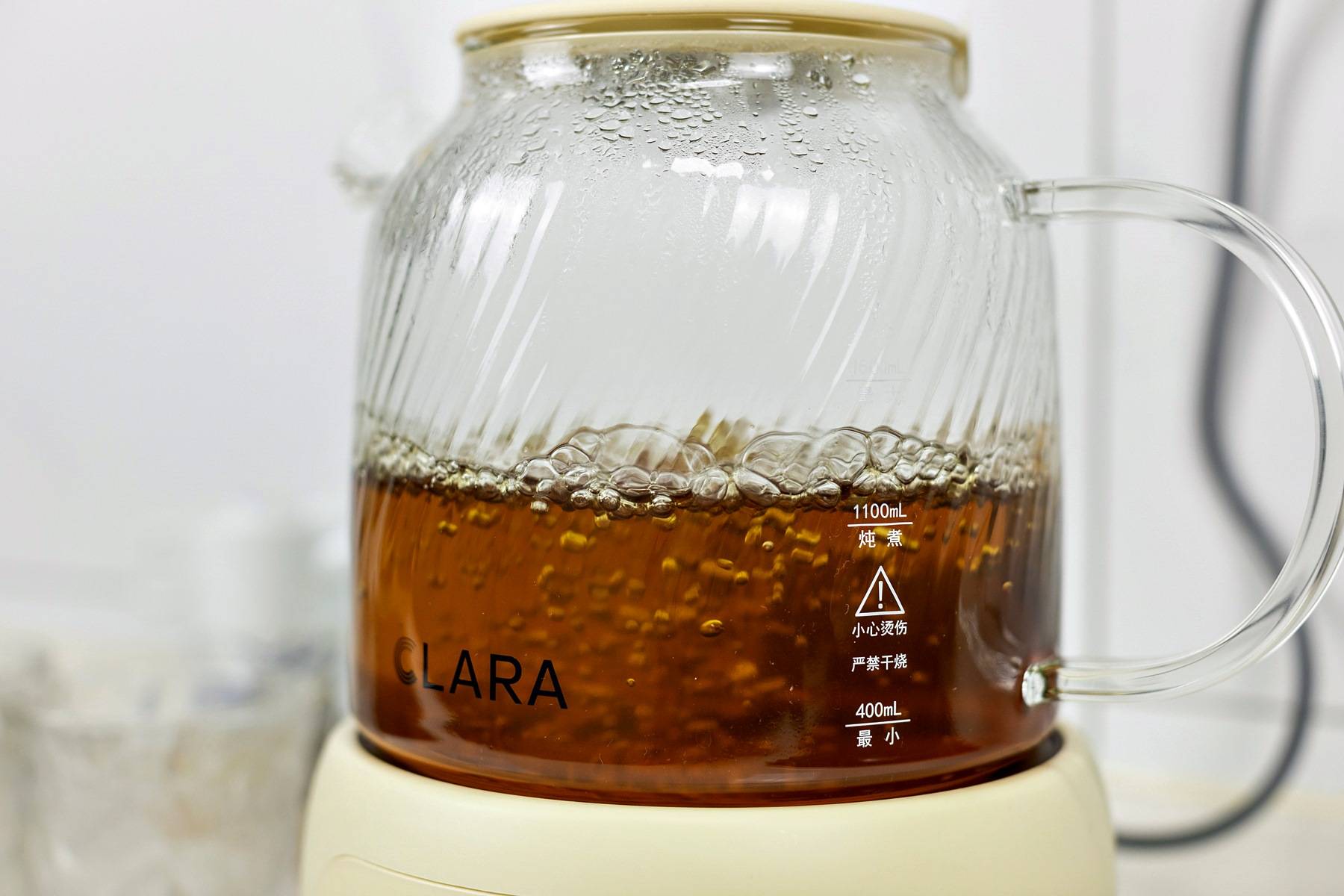 当然,我们都知道玻璃受到剧烈的温度变化时会有炸裂风险,而clara可莱养生壶的玻璃壶身,采用的是99.9%高纯度高硼硅玻璃,可承受180°C冷热温差,刚烧完水直接用凉水清洗也不用担心炸裂的危险。