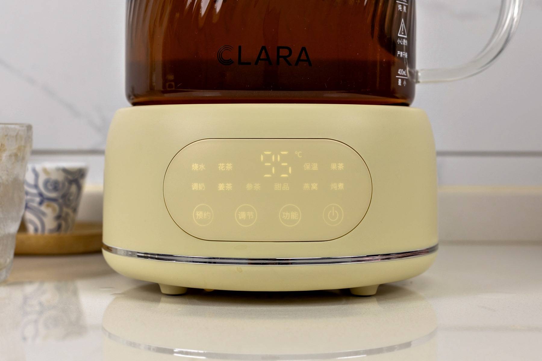 功能方面,clara可莱养生壶自带烧水、花茶、果茶、姜茶、参茶、调奶、甜品、燕窝、炖煮和保温10大功能。不同的功能都有最佳的炖煮温度,实测用它煮出来的花茶色泽诱人,茶香扑鼻。用户完全不再需要担心水温过高破坏茶叶营养成分或水温过低无法充分释放茶香。单独的调奶功能深受宝妈喜爱,一键直达45度水温,宝妈泡奶再也不用用倒来倒去测水温了。而且,冲泡不同饮品只需简单清洗,还不会串味,喜欢品茶的人士不容错过。