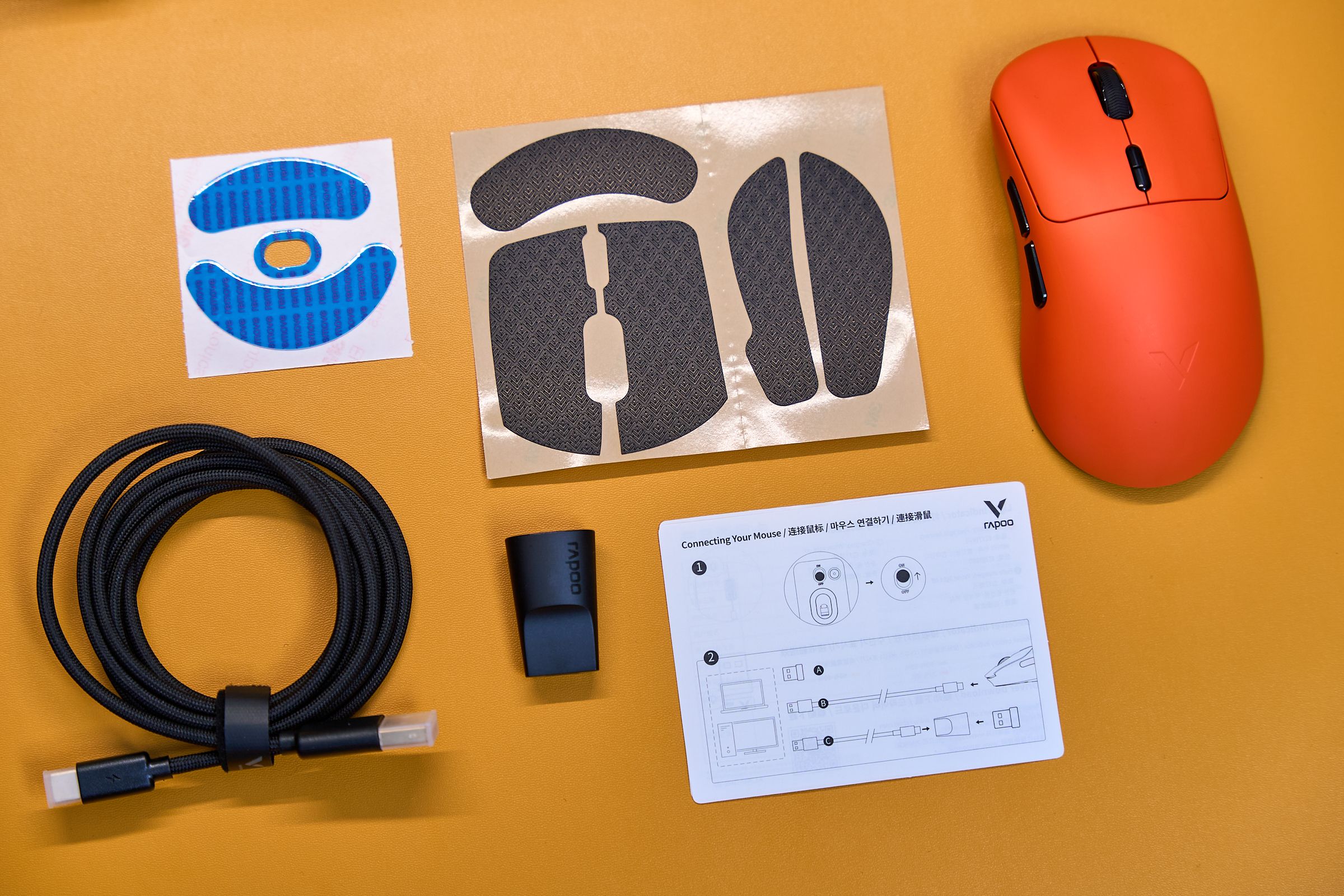 配件包含编织数据线、USB转接器、nano接收器、备用PTFE脚贴和防滑贴。nano接收器体积小巧,并且带有电量指示灯,随时知悉鼠标剩余电量,可吸附在鼠标底部收纳仓,便于携带且不易丢失。