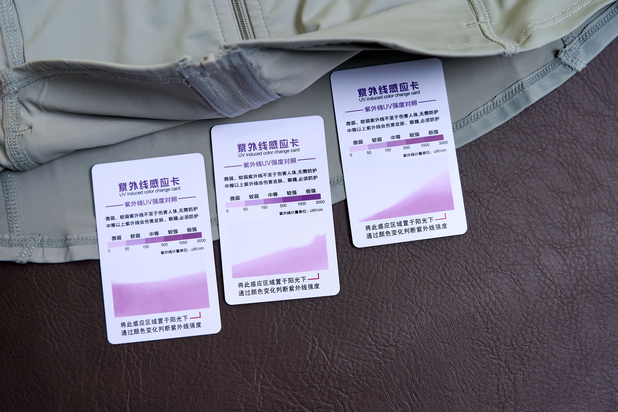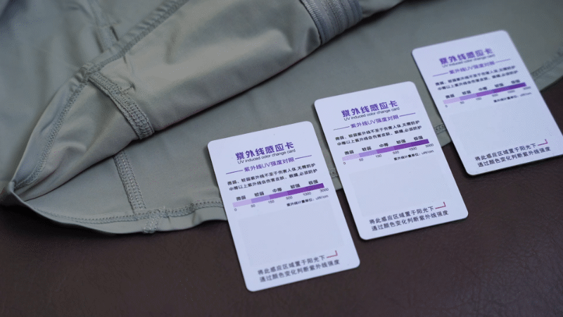 我专门买了紫外线测试卡和紫外线手电做了个暴力测试:直接用防晒衣把测试卡遮一半,然后用紫外线手电一顿猛照,卡片直接紫得发黑,防晒衣遮盖的部分,卡片几乎没变色。