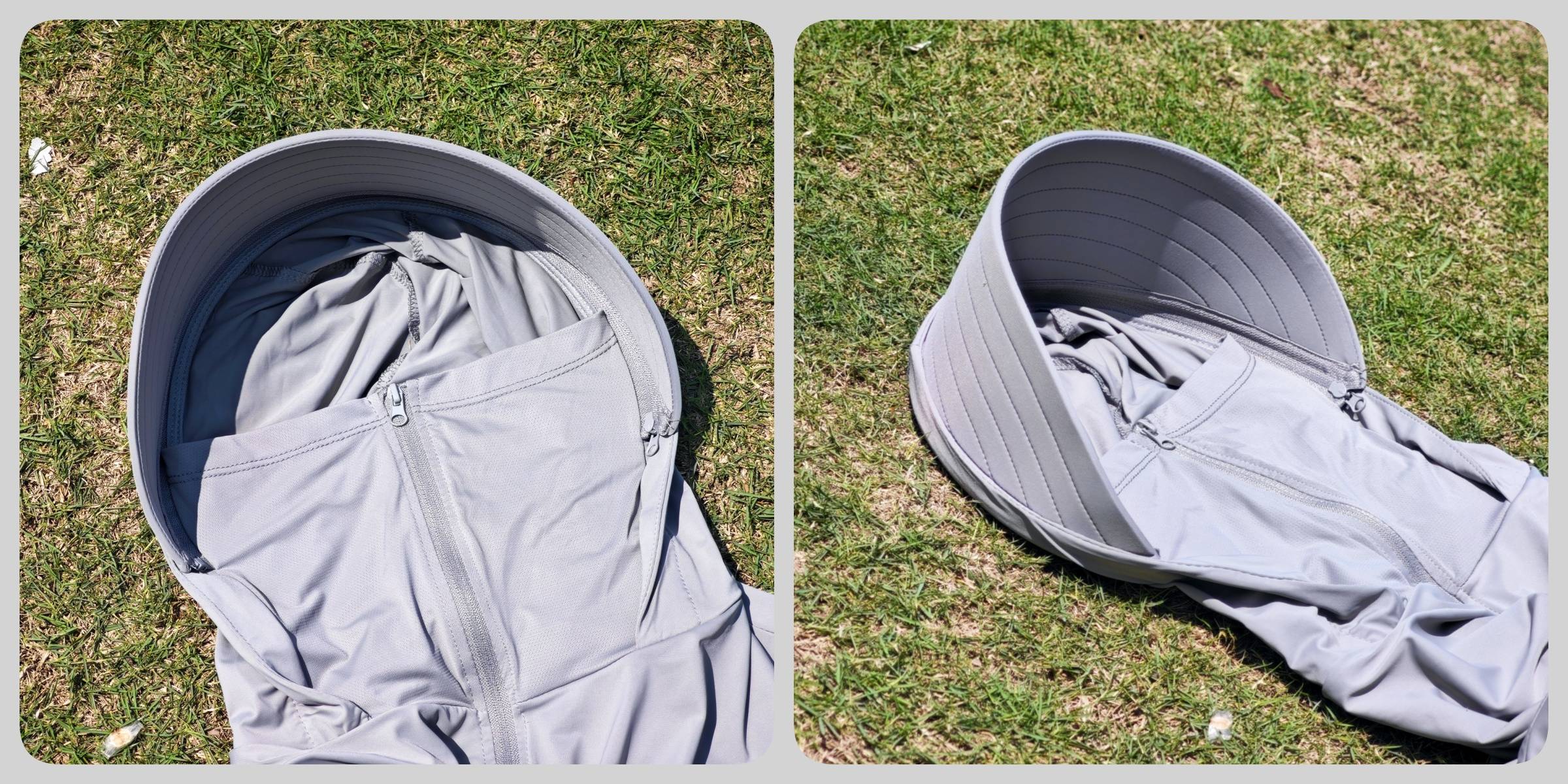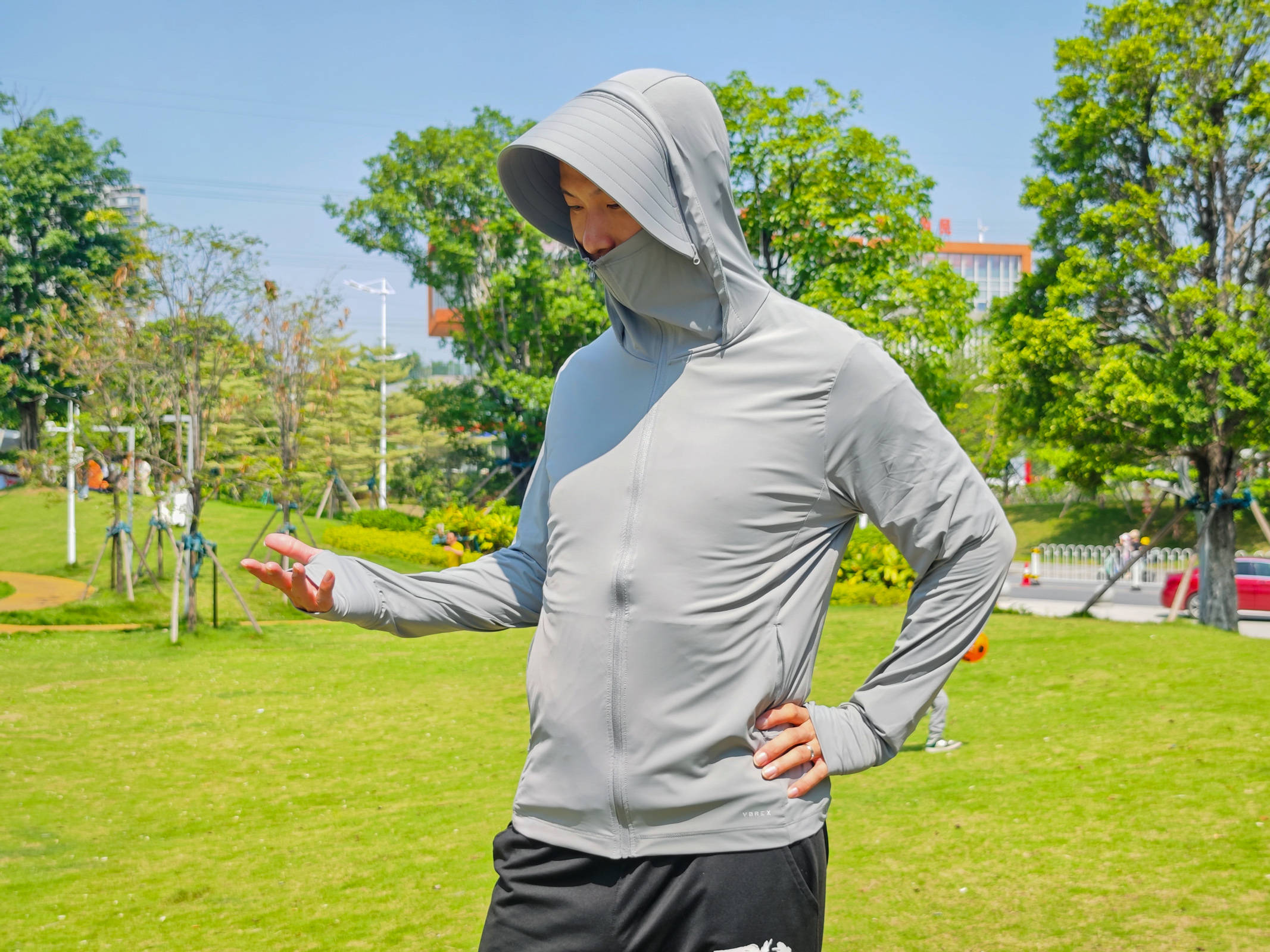 ▲我个人特别喜欢 VBrex防晒衣 的防晒兜帽设计,采用了 加厚海绵材质 以及 拉链可拆卸设计 ,戴起来相当于多了个鸭舌帽,能有效遮挡阳光,避免晒脸以及刺眼的问题。领子也是特殊设计,拉链拉上后直接成了 防晒面罩 。