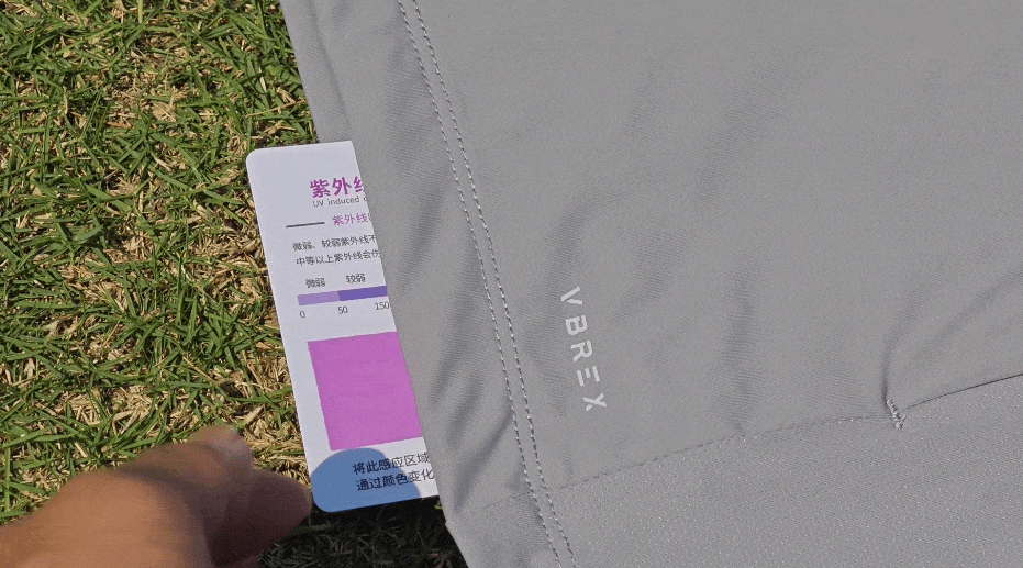 ▲将紫外线感应卡放一半在防晒衣面料下,另一半阳光直晒一分钟。之后抽出卡片一看,直晒的另一半早已变成了深紫色,被防晒衣盖住的部分依然是白色,抽出来后迅速也被晒成了深紫色。这充分证明了 VBrex防晒衣 的防晒能力,毕竟它采用了 专业级PTAS3.0冰晶原纱 搭配 双层高密度TIO2防晒因子 ,UPF达到200+水平 ,实现了 突破性全波段阻隔 ,有效避免了各波段紫外下照射带来的晒红、晒黑、晒斑、老化等皮肤损伤问题。